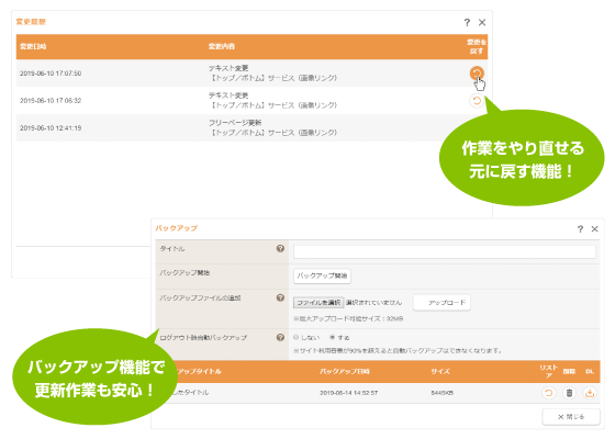 ログアウト時の自動バックアップや作業を元に戻せる安心機能!
